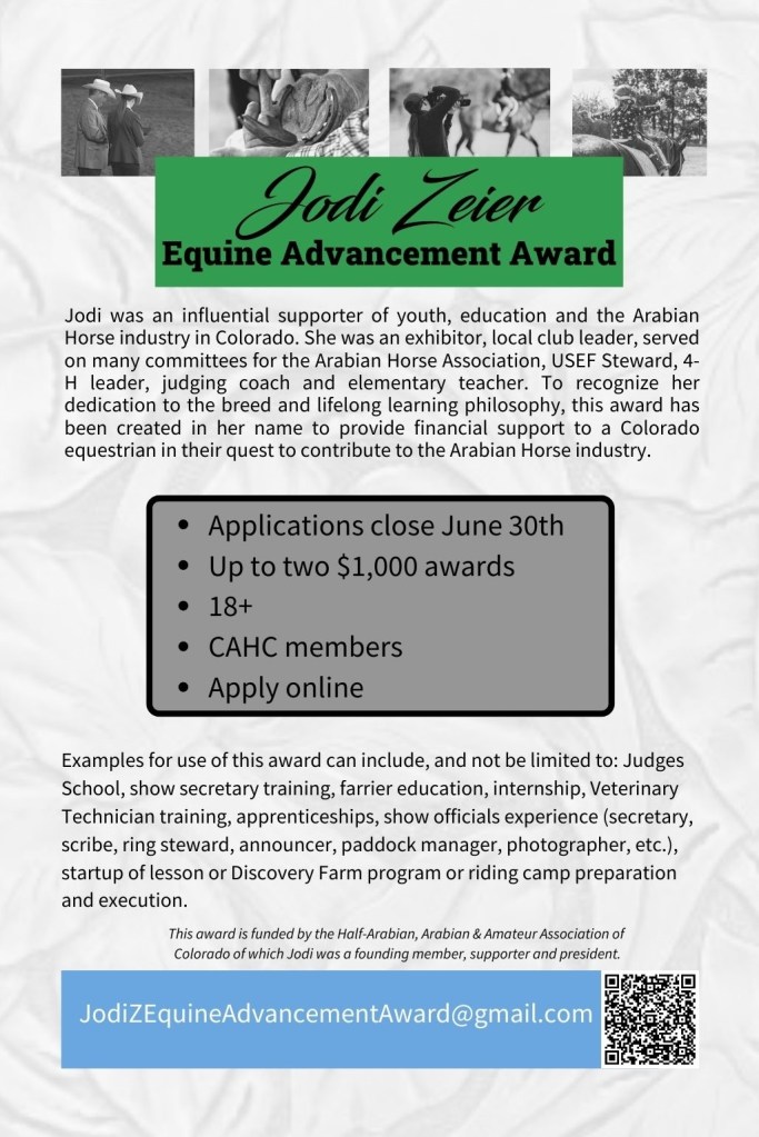The Half-Arabian Club (HAAAC) has dissolved and it’s membership has been absorbed by the CAHC. We are using their funds to support a scholarship program in Jodi Zeier’s name. It is only available to CAHC members and is a great incentive for our members!